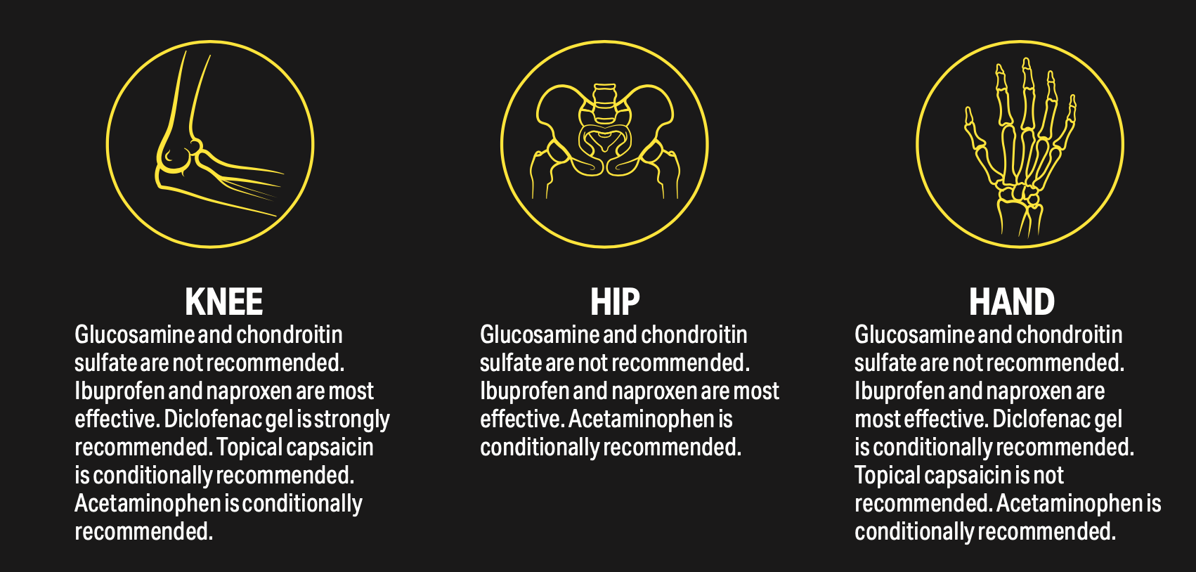 Acetaminophen is conditionally recommended for patients with knee, hip, and/or hand OA.2 Evidence suggests it may not be the most effective medication for OA, but it can be an important treatment option for patients who are unable to take NSAIDs.2 The maximum daily recommended dose of 3000 mg to 4000 mg acetaminophen per day, depending on the product, should not be exceeded because of the risk of hepatotoxicity. Alcohol consumption should be avoided.6 To prevent poten- tial overdose, it is critical to educate patients on the importance of reacing the product label to ensure that they are not taking multiple acetami- nophen-containing products.6